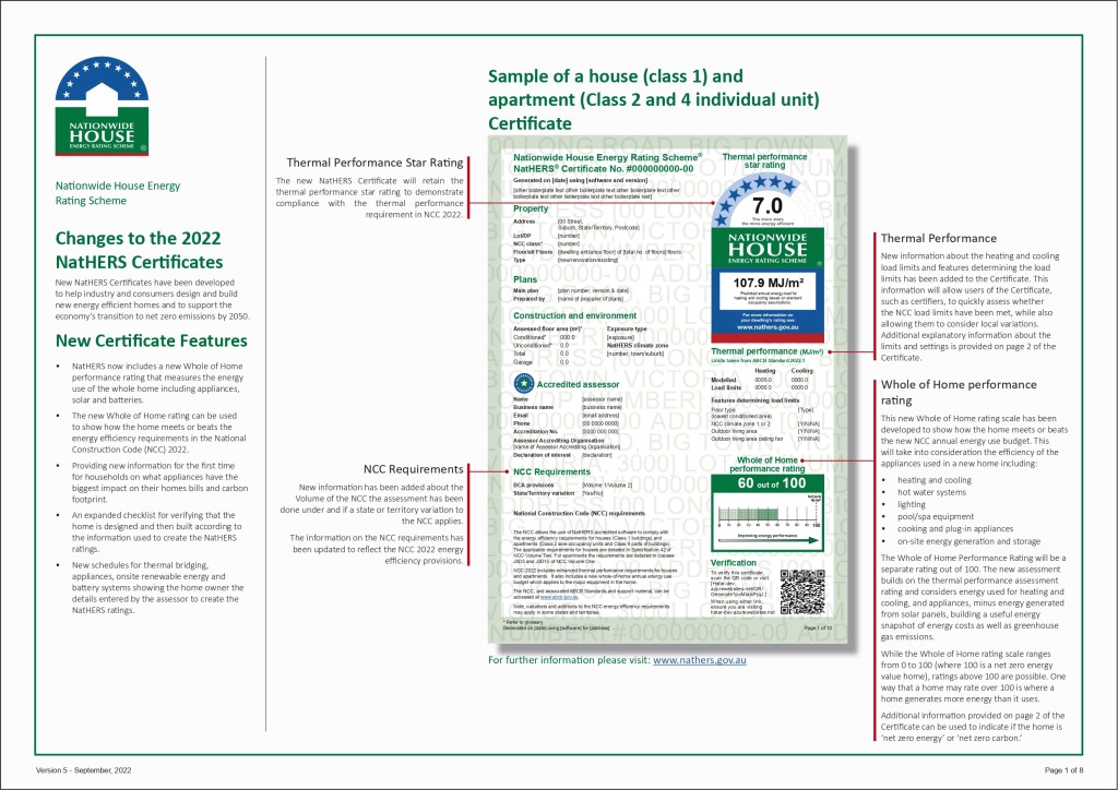 New 2022 NatHERS Certificates include additional information to support the changes to residential energy efficiency in the National Construction Code (NCC) 2022.